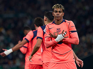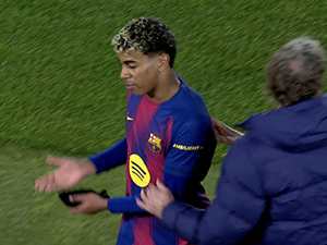 Tiền đạo cánh phải Lamine Yamal tỏ rõ sự thất vọng khi bị HLV Hansi Flick rút khỏi sân ở trận Barcelona thắng Frankfurt.