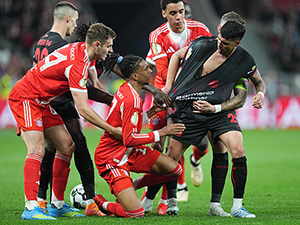 Michael Olise đã có 1 pha xử lí khôi hài trong trận Bayern Munich thắng Leverkusen 2-0 tại vòng bán kết cúp Quốc gia Đức.