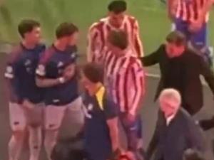 HLV Diego Simeone và con trai Giuliano Simeone đã bức xúc, xô đẩy Ben White sau khi hậu vệ của Arsenal giẫm vào huy hiệu của Atletico Madrid trong lúc đi vào đường hầm. |